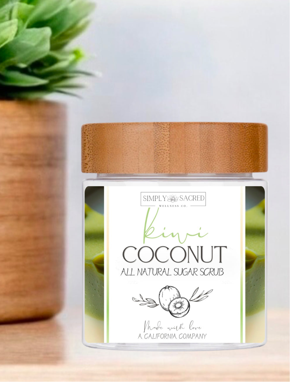 Our all-natural Kiwi and Coconut sugar scrub is a delightful and soothing skincare product designed to exfoliate and nourish the skin. Our sugar scrub is a body scrub that utilizes sugar as its primary ingredient for removing dead skin cells while revealing smoother, healthier skin underneath. Our Sugar scrubs are one of our most popular products and are key routine due to their natural exfoliating properties and the additional benefits of their moisturizing components. Our sugar scrub is a delightful addition to any skincare routine, offering both exfoliation and hydration while providing a sensory experience that can be both relaxing and invigorating.