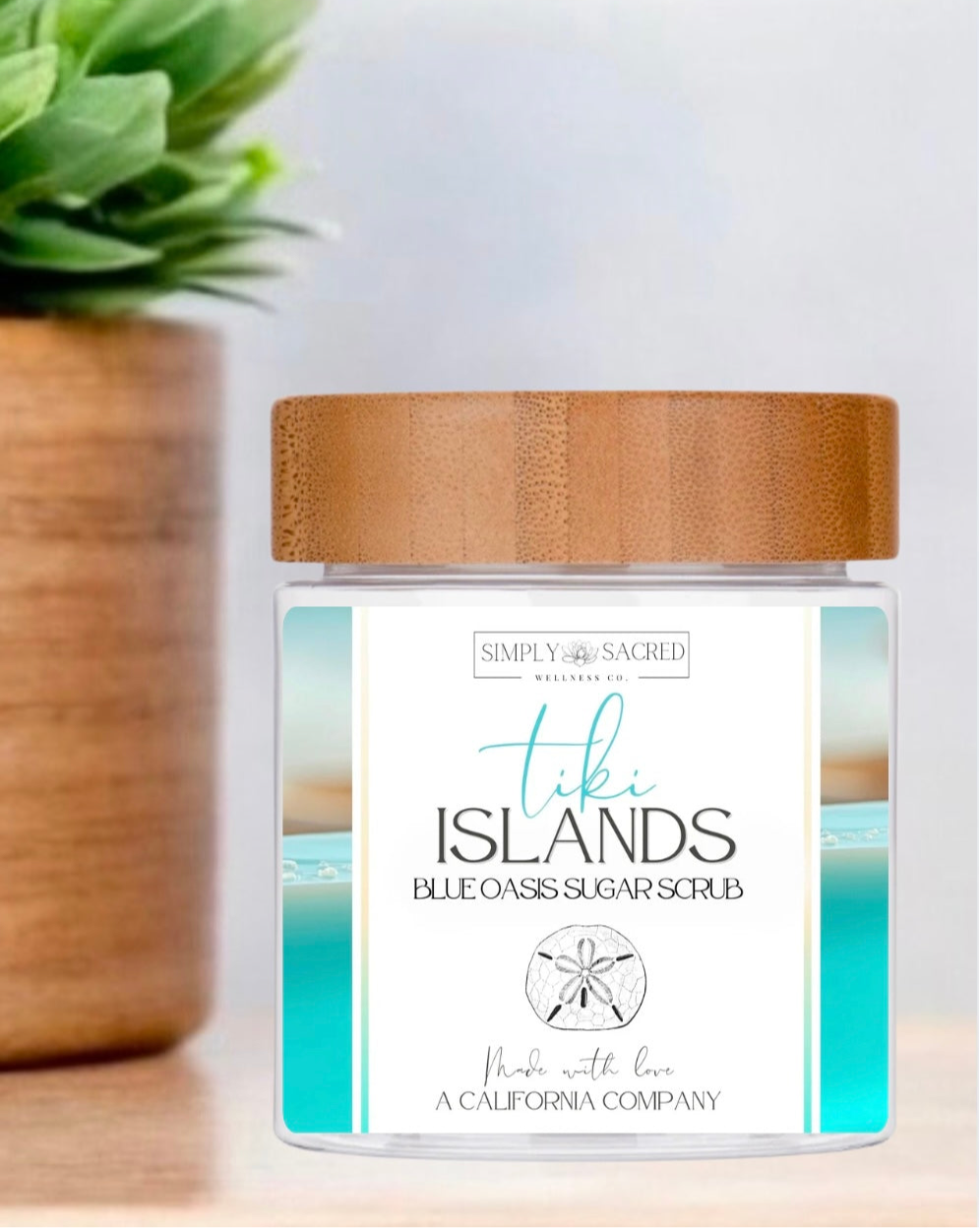 Organic Fair Trade Sugar, Sunflower Seed Oil, Coconut Oil, Sweet Almond oil, Palm Kernel Oil, Hemp Seed Oil, Jojoba oil, Avocado Oil, Olive Oil, Glycerine, Distilled H2O, Essential oil fragrance, Mica powder minerals, Dried Hibiscus, Coconut flakes, Vitamin E, Liquid Castile Soap (foaming agent), Honey & Lots of love!
